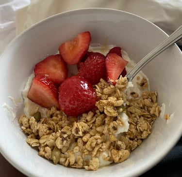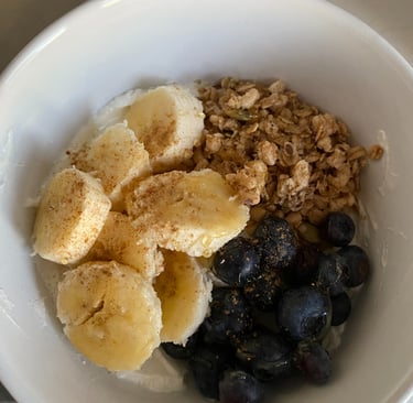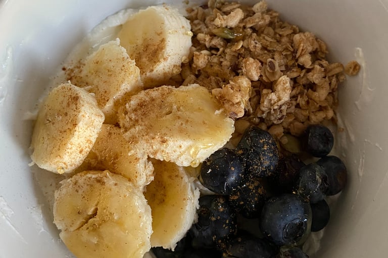 Add yogurt to a bowl, sprinkle oats/granola, slice some fruit on top, and drizzle honey or peanut butter. If I’m feeling extra - and I usually do-, I add cinnamon.